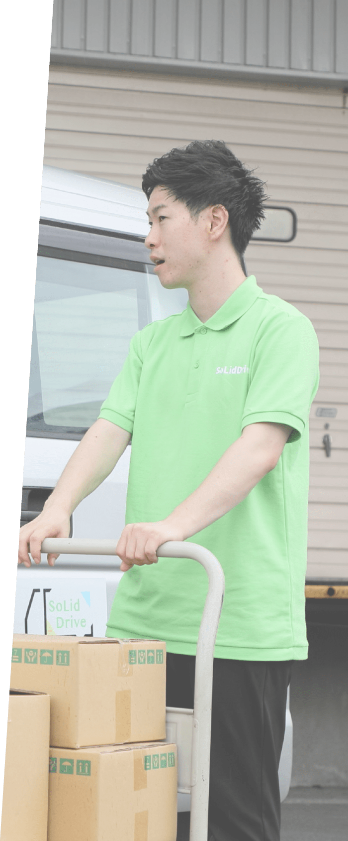 SoLidDriveは関東を中心とした軽自動車のバンを利用した配送業者です。自社で厳選した経験豊富なドライバー陣がお客様の大切なお荷物1つ1つを心を込めて配送いたします。